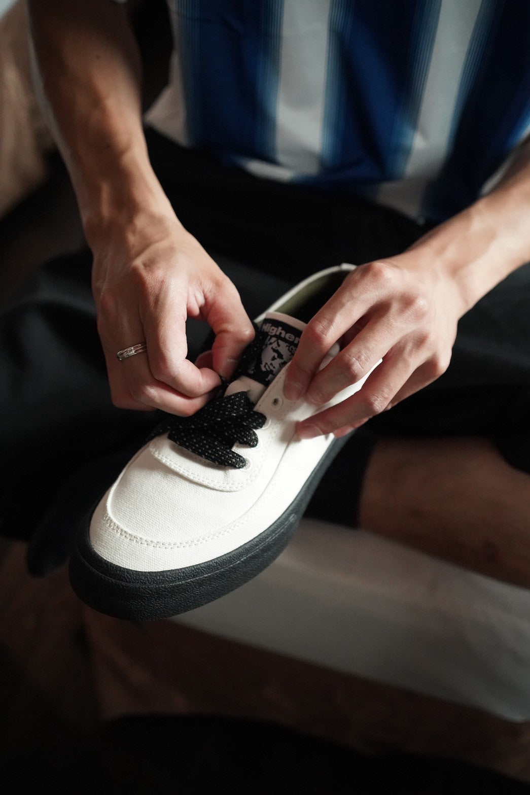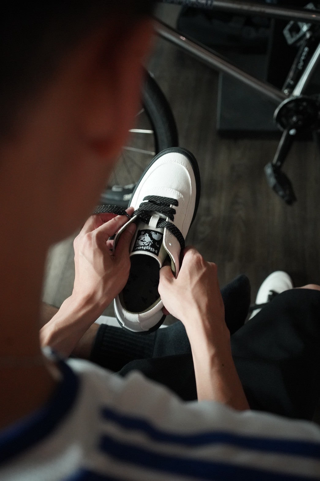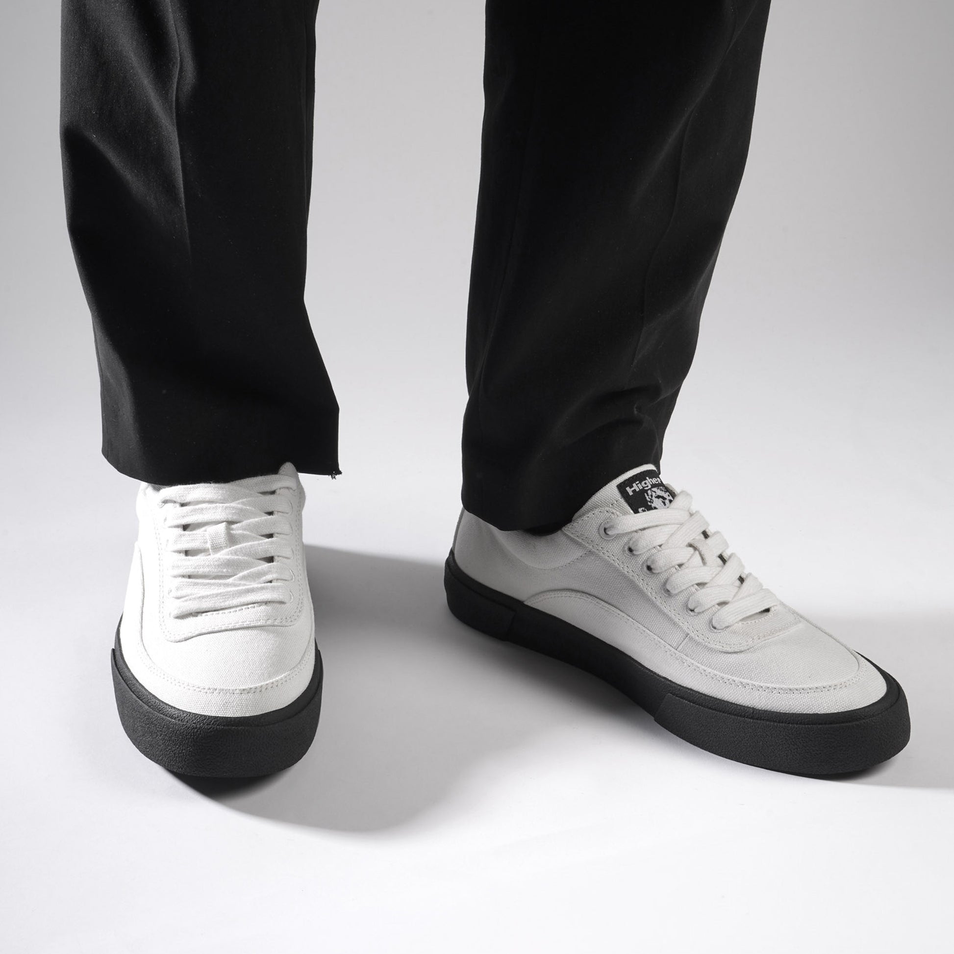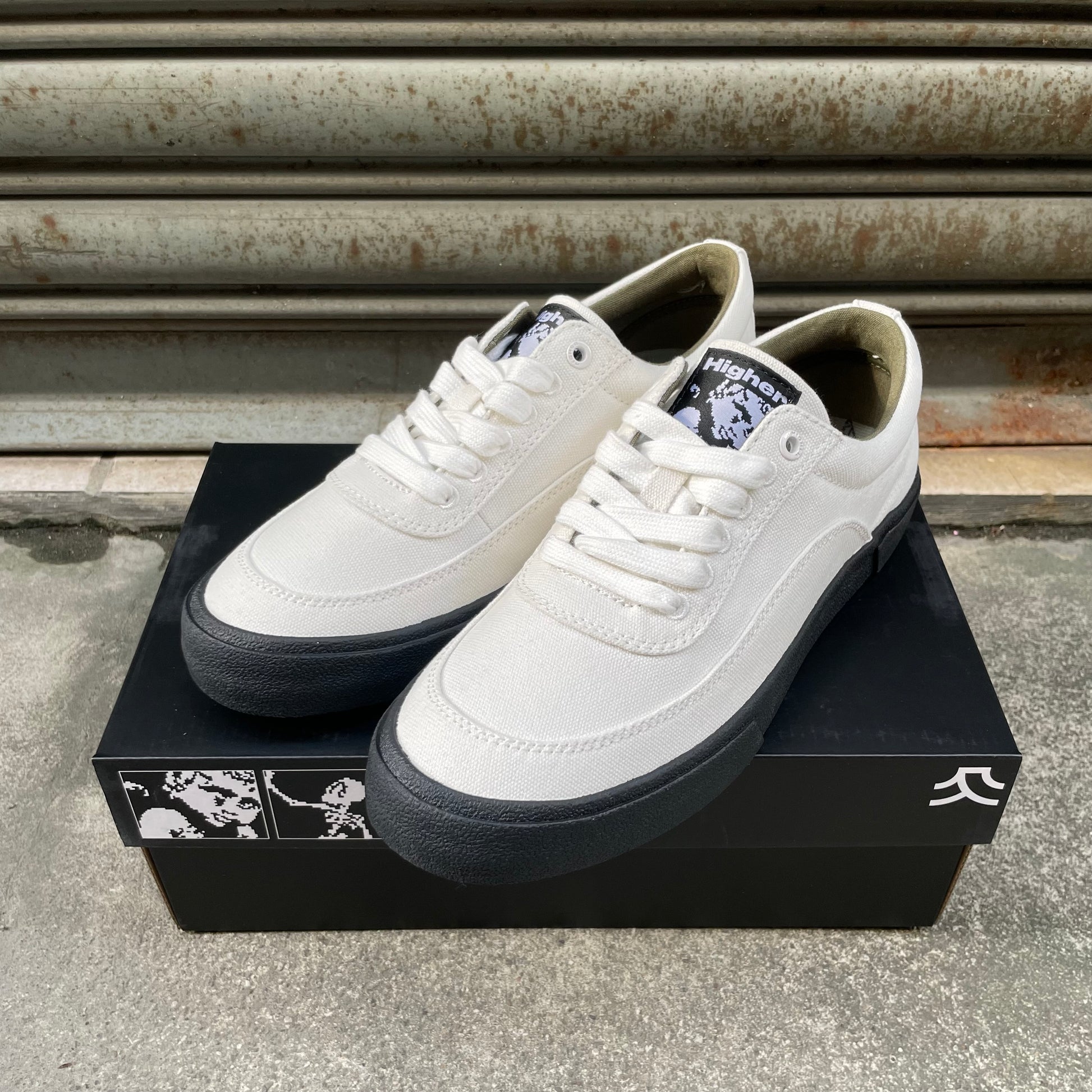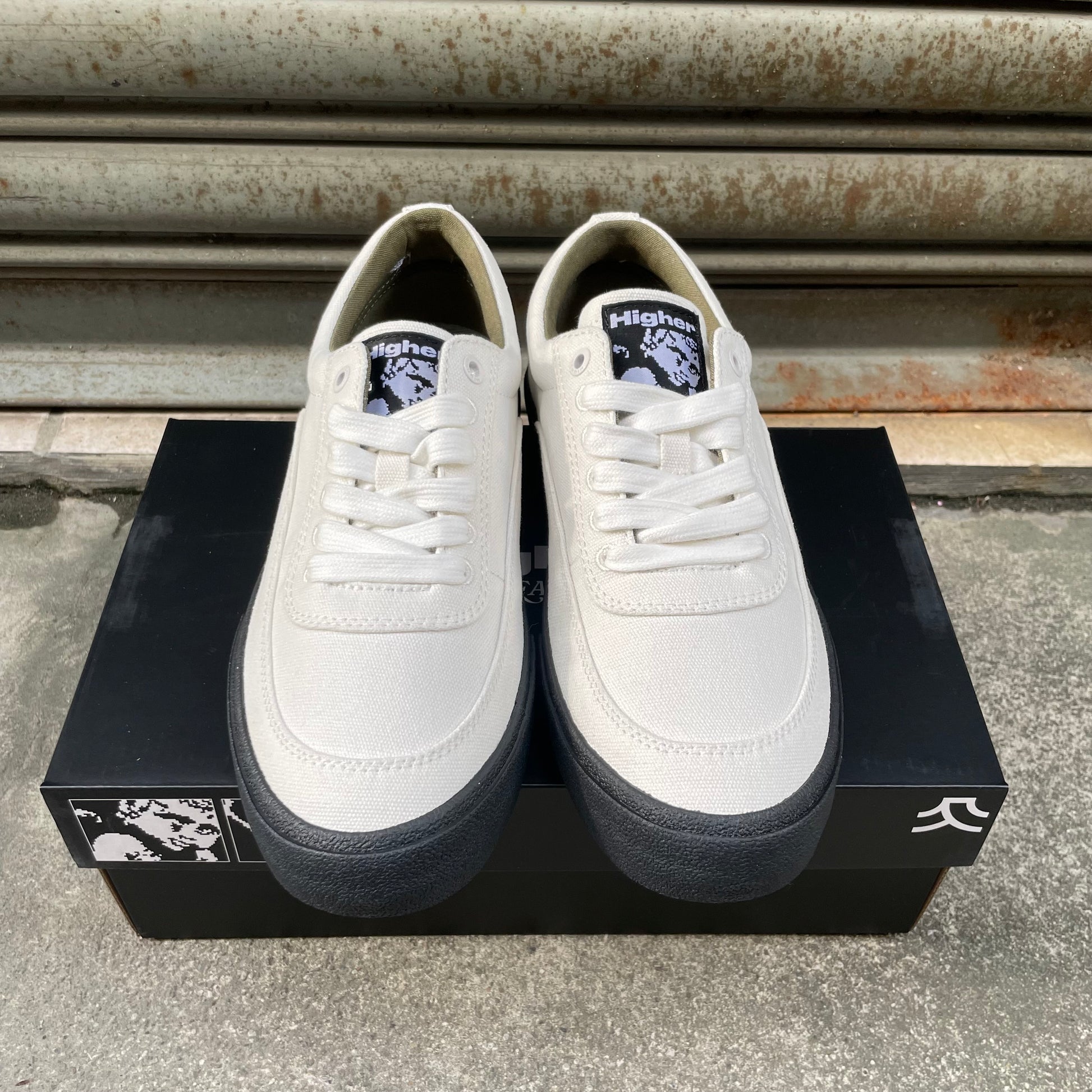 它擁有極簡乾淨的外觀和低調輪廓,並在鞋頭與側邊強化設計,鞋舌上縫有 Higher 原創藝術標籤,並額外附有一組鞋帶可供替換。鞋內襯選用人造霧面皮革與帆布材質。