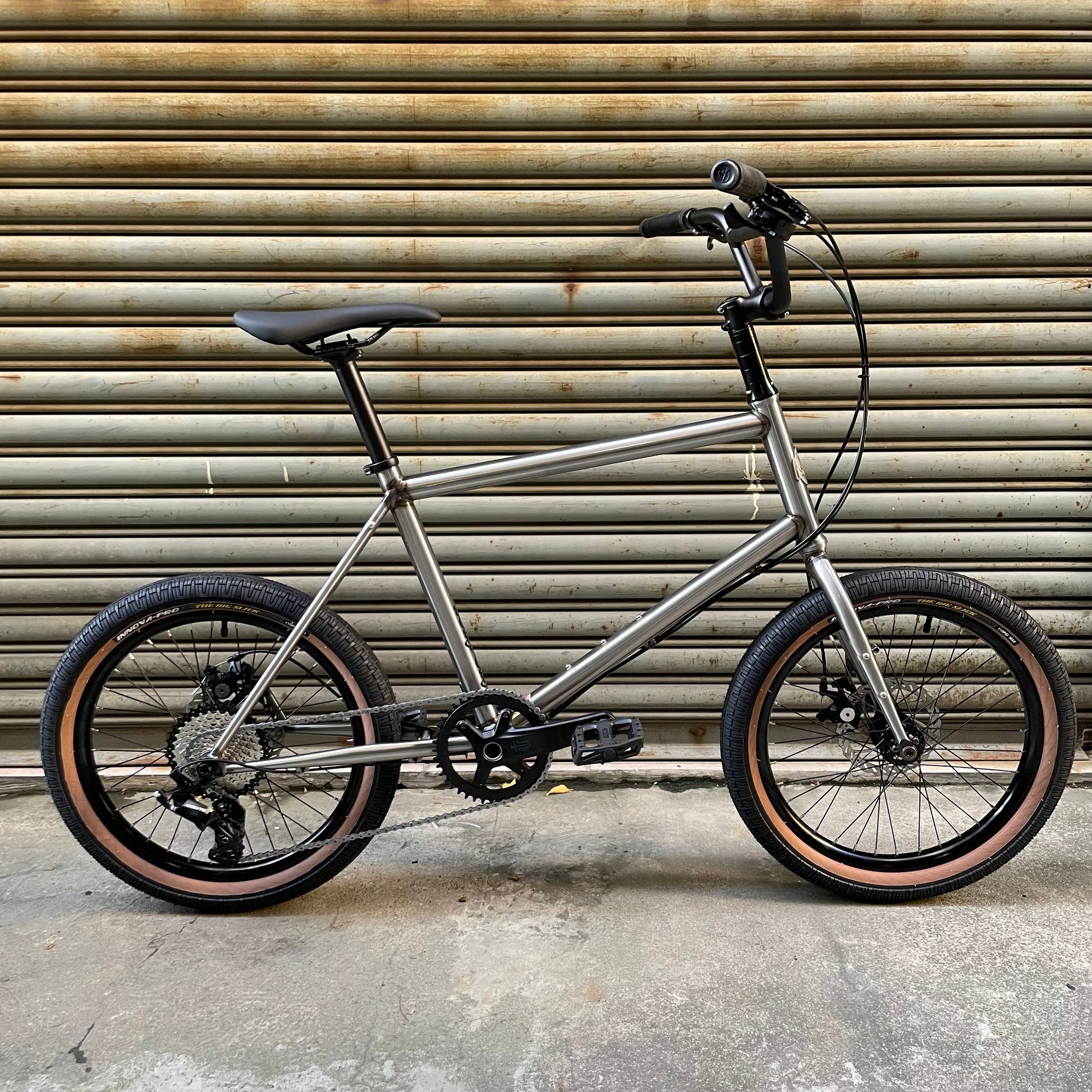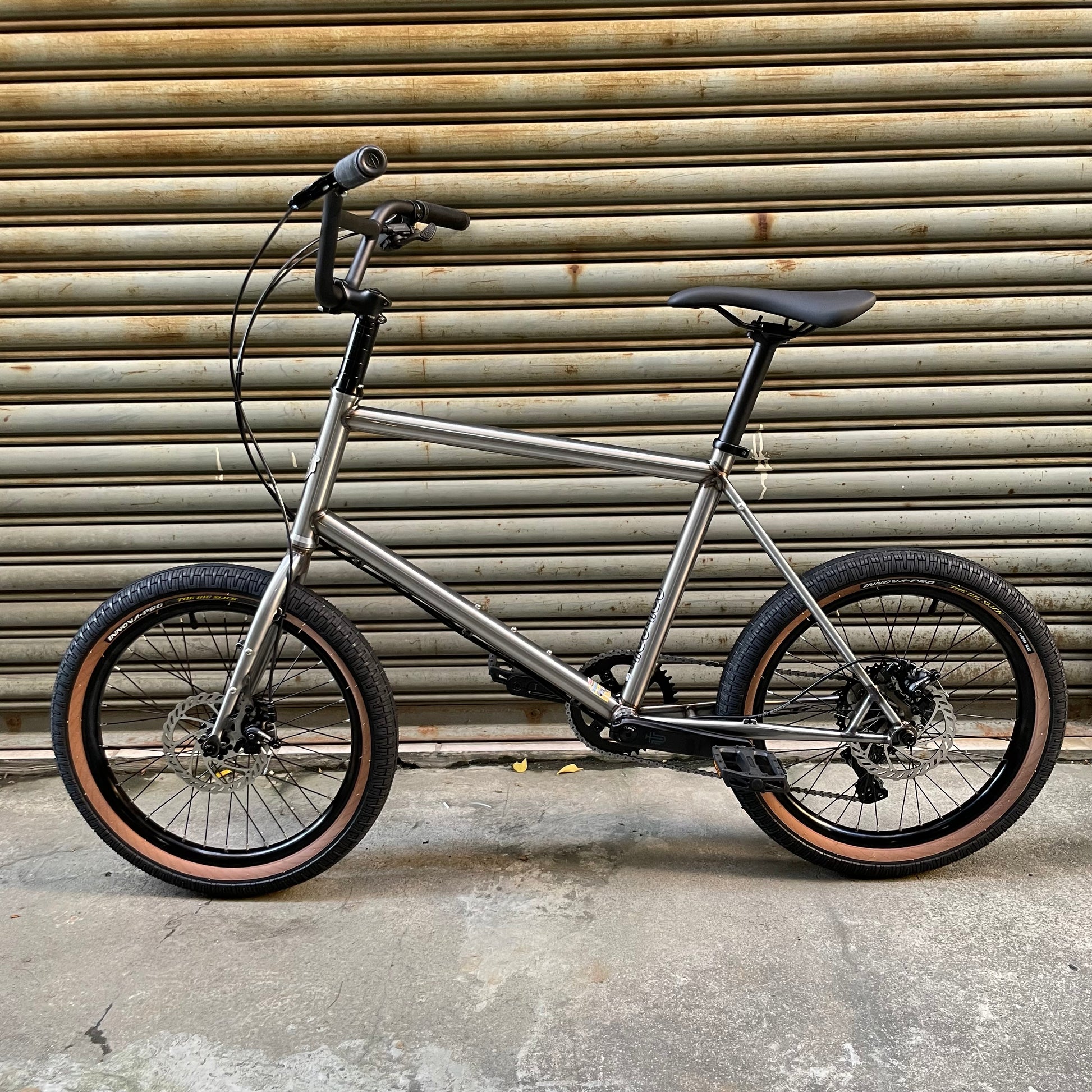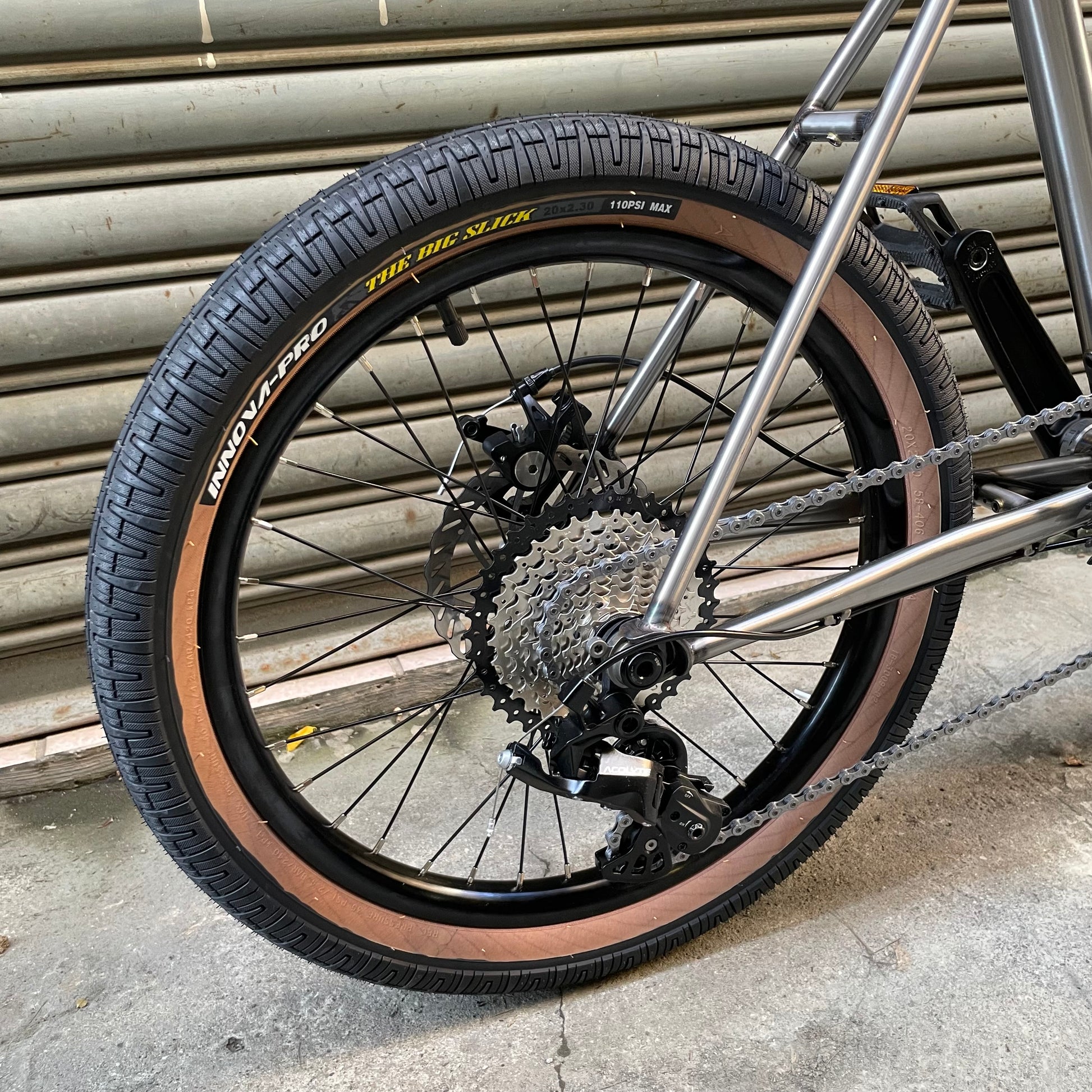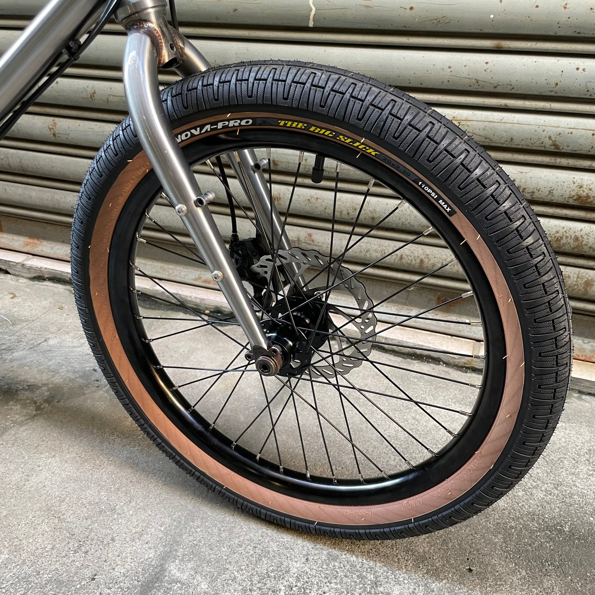 外胎:Innova -Big Slick 20"X2.3" 黑色膠邊外胎,相容 20 吋(406 規格)BMX 外胎,最大可容納 2.5" 寬度